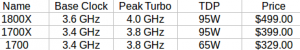 Today there are three Ryzen 7 CPUs available, the 1800X, 1700X, and 1700, all 8C16T devices, and all are significantly cheaper than their Intel counterparts. More interesting is that the TDPs for Ryzen are significantly lower than Intel’s, 95W vs 140W and 65W vs 91W for the 1700X vs the Intel 7700K. On that last one AMD had a sizable 46% advantage on Cinebench but it was a case of 8C vs Intel’s 4C, price differences not withstanding. For “Recorded Idle Wall Power”, the AMD 8C systems had an ~50% power advantage over Intel’s 8C systems while the 7700K 4C had a 25%, 10W, power advantage over AMD’s 8C 1700.