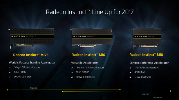 Starting in Q3 AMD’s Radeon Instinct line of server accelerators will be available to OEM partners. First announced late last year, Radeon Instinct products are tailored for use in compute intensive applications like machine learning and HPC. AMD’s offering three models: the MI6 based on Polaris 10, the MI8 based on Fiji, and the MI25 which uses AMD’s new Vega 10 chip. Despite the use of older chips like Fiji and Polaris, AMD held back on launching the Radeon Instinct product stack until now to coincide with the Vega launch.