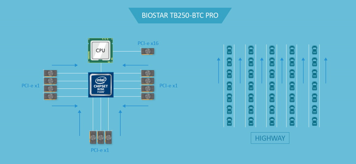 Other manufacturers utilize low-level chipset bridge thus providing a narrow passage to the graphics card being used, affecting overall system performance due to bottlenecking of each graphics card. BIOSTAR addresses this by utilizing Intel’s B250 chipset allowing more bandwidth to be used and be utilized by the displays, with all 12 PCI-E groups populated. This allows all cards to work at their top-speed without any loss for the most effective setup ever.