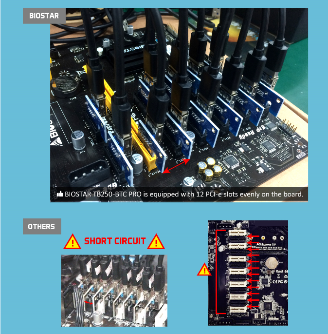 Biostar is going all in on the current wave of cryptocurrency mining with the TB250-BTC PRO. According to the company this is the world’s first native 12 PCI-E slot motherboard. These are PCI-E 1x slots of course, not the full-length PCI-E 16x slot that we’ve become accustomed to seeing on high-end motherboards. Based on the press release and materials accompanying this product launch it seems that Biostar understands the needs of cryptocurrancy miners better than any other motherboard vendor. Here are some selections that show to me that Biostar, despite some rough translations, has done their homework on this market: