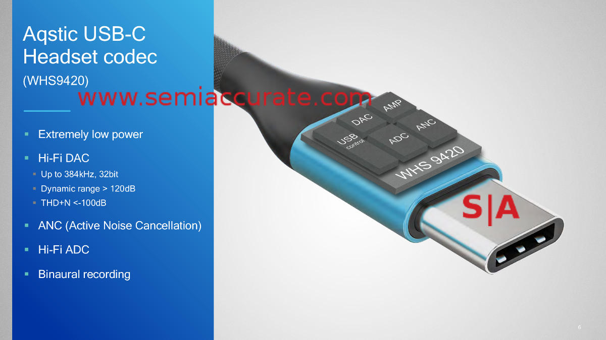 The Aqstic USB-C Headset codec, part name WHS9420, can do 32b 384kHz stereo recording and playback with a dynamic range of >120dB and a THD + N <100dB. If you know audio you are probably impressed, if not lets just say it is really good. The prototype USB-C headset shown below are not just good speakers but also do active noise cancellation and binaural recording. Why? Think voice UIs.