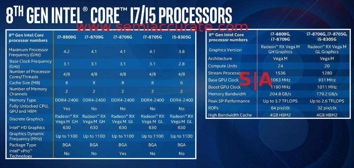 SemiAccurate told you about Kaby-G when they were unveiled in early November and now Intel is putting out a little more information, none of which should be a surprise. The short version is you take an AMD Vega Mobile part, tweak the package a bit, and slap it beside an Intel CPU and you have Kaby-G.
