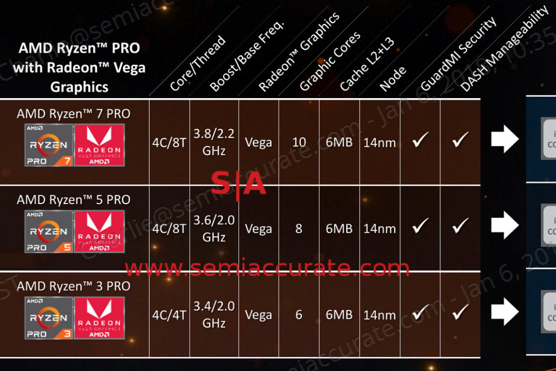 One of the more important parts AMD talked about was the mobile Ryzen Pro parts in 7/5/3 guises. These are simply the Ryzen ‘amateur’ parts with the manageability features not turned off, but they are still very important. Why? AMD has nothing in this very lucrative corporate space, enterprise needs manageable laptops and Intel has clear sailing. This spring that changes with the mobile Ryzen Pro parts, they might not excite enthusiasts but they will up the bottom line.