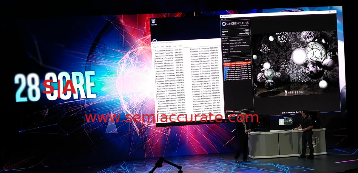 Back to the tech, Intel was trying to upstage AMD’s 32-core Threadripper 2 launch on the following day. Like last years 18-core CPUs, the 28-core part didn’t exist a few weeks ago. The company took the big XCC Xeon die and didn’t fuse it off as much as normal so it could be demo’d as a ‘consumer’ part. The boards were server/workstation ones with 29-phase power, industrial water chillers were needed to make the demo work, and the CPU itself was undoubtedly a one-in-a-million golden sample needed to hit 5GHz on all cores.