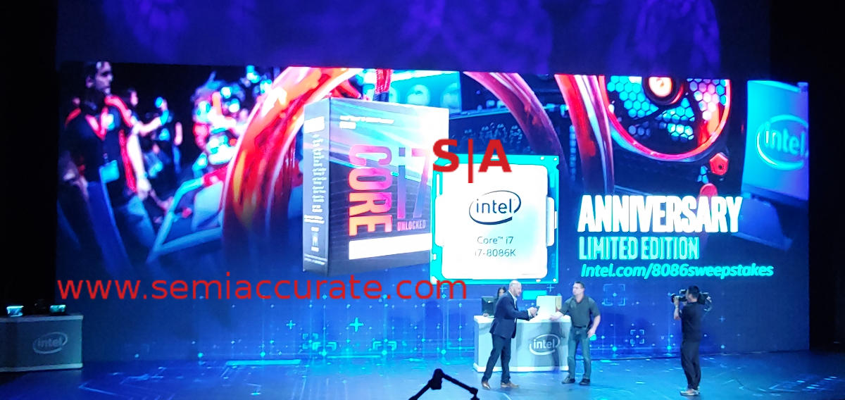 The real big news at the keynote was the launch of the Intel 8086K CPU, a 4.0/5.0GHz chip. This one is so good Intel is not sampling the press or even giving out specs on it. It is just a highly binned Coffee Lake part that ups base clocks by 300MHz and 1C turbo by the same amount. Anandtech bought one and tested it with some pretty withering results. If you are wondering why we say Intel is fatally allergic to questions and avoids the press at all costs, look to their behavior on the 8086K, it explains everything. The lack of sampling is simply due to someone forgetting it, really, no intent there.