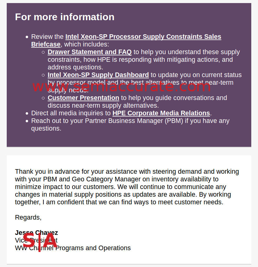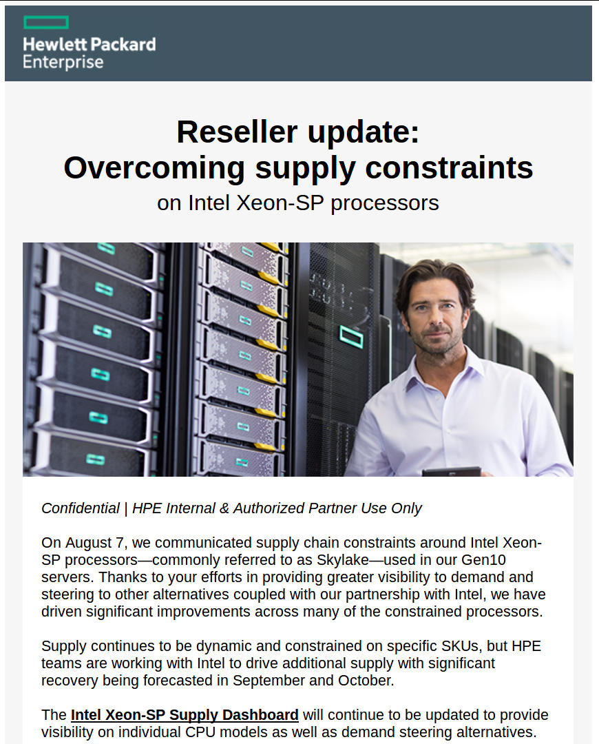 The page is marked, “Confidential | HPE Internal & Authorized Partner Use Only” but it is quite open and does not require a login. (Note: We are not linking it because of all the sites that steal our stories, rip us off, and don’t credit) All sub-pages linked do however require a login as of this writing. The page says in no uncertain terms that Intel can not supply Xeon-SP CPUs and it is definitely impacting sales for HPE and presumably every other large industry player as well.