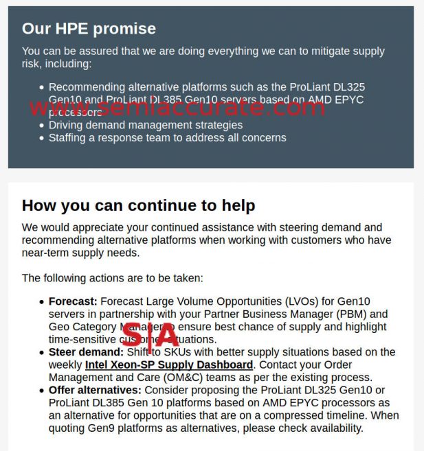 Intel can’t seem to supply 14nm Xeons so HPE is recommending AMD Epycs instead. Most SemiAccurate readers will understand why there is a 14nm shortage at Intel but even with that background, this page is pretty brutal.