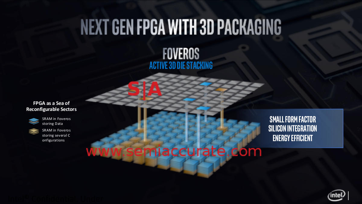 The most interesting thing about the technology is the flexibility it allows. This goes beyond the usual mix and match process tech that conventional packaging technologies and chiplets like AMD’s Rome allows for. Foveros will allow things like putting blocks of functionality, be that memory, I/O, or whatever, close to the parts of the chip that consume or produce data for it. The trick with Foveros is that those blocks can be in the Z dimension, not X/Y, and can be on a different die, process, and power rail. As you can see above, Altera sees this as putting memory and storage closer to the blocks that use it. From that simple concept you can run wild once stacking comes in to play for real.