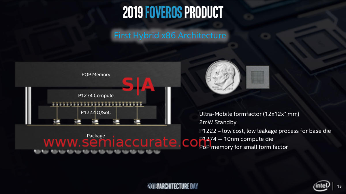 What you see above is the first public showing of Lakefield, the first product based on Foveros technology. It is a big.Little system with four ‘small’ Atom cores and one ‘big’ mainstream Ice Lake-ish core. Intel said it was designed for a specific customer and comes in a 12x12mm package. For those of you not up on packaging minutia, that is the standard dimensions for cell phone/tablet SoCs. (Note: Feel free to insert your own joke about Intel’s commentary on ARM’s big.Little and how they would never need to do it themselves, it is too easy for us professionals. We would get no points because the complexity multiplier is zero.)