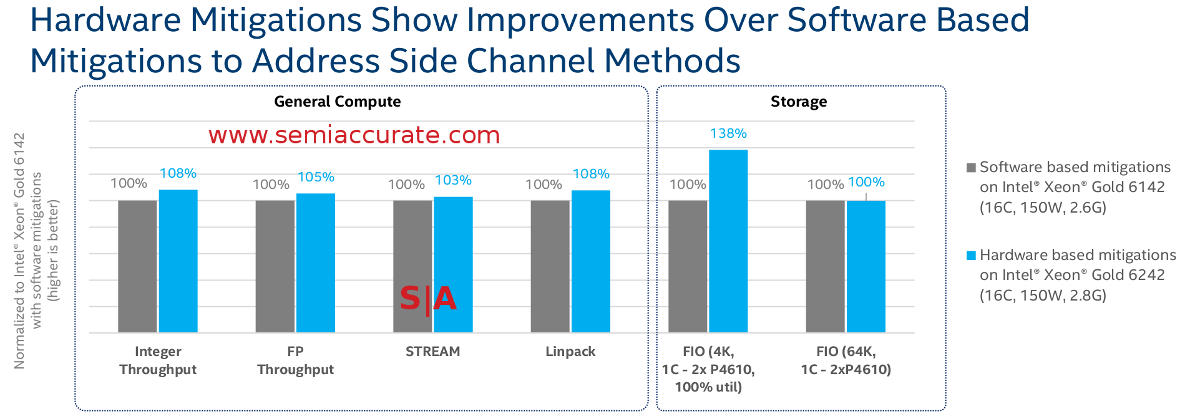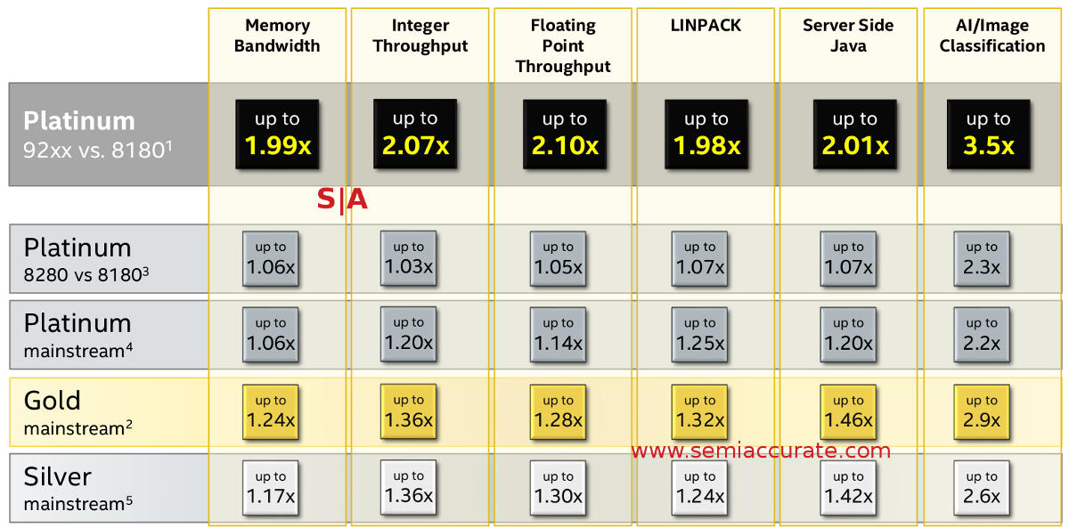 So how does Cascade Lake perform? Assuming you are a sane customer an applied all the Spectre/Meltdown patches, it is unquestionably better. Last August, SemiAccurate said Cascade would speed up, “6-8% on a per-socket basis“. If you look at the numbers Intel put out for performance, where you can compare same core counts to same core counts, it looks like we were right on the money. The up shot of this is better CPUs with more features for the same money, this is a clear win.