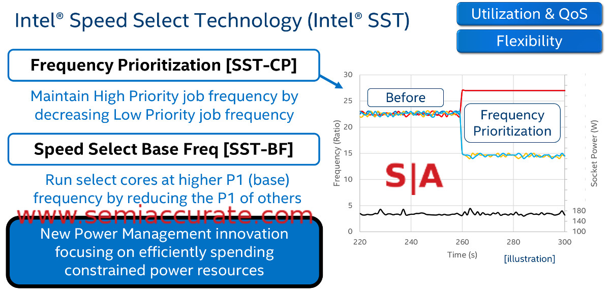 The second of these big bangs is called Speed Step Technology (SST). The idea is easy enough to grasp, you can have a few cores running at a higher base (P1) clock by decreasing the P1 of the other cores in order to maintain the same TDP. The same also works for Turbo, pick some cores that will go higher than others while maintaining the same TDP. Each SKU with SST not fused off has five parameters that can be set in three profiles, Active Core Count, TDP, TjMax, Base (P1) Frequency, and All-Core Turbo (P0n) Frequency.