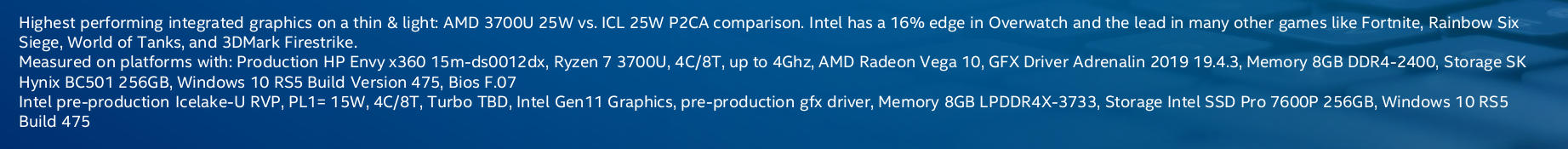 When you read the fine print, the one line that has actual performance claims, doesn’t really compare what you think it does. The gaming claims are against an AMD 3700U at the 25W level for each in pretty casual games. This wouldn’t be an issue but Intel specifically does not list the CPU that was used to test and whether or not it is a production model or ever will be one. It is also a 15W device juiced to 25W, nothing wrong there, but what is both wrong and unethical is that Intel didn’t list clocks for either one.