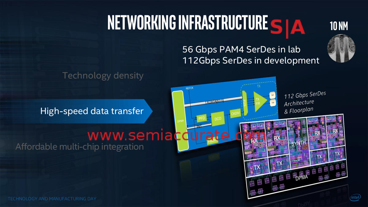 If that sounds harsh, look at the next two tiles, the 58G and 112G, both made at Intel on their famed 10nm process. They said so directly at Manufacturing Day in 2017, you know the one where they said 10nm was in great shape, yields were excellent, and volume was ramping hard. We laughed at the claims even if no one else did. That said, see the slide which clearly says 58G and 112G were built on Intel 10nm.