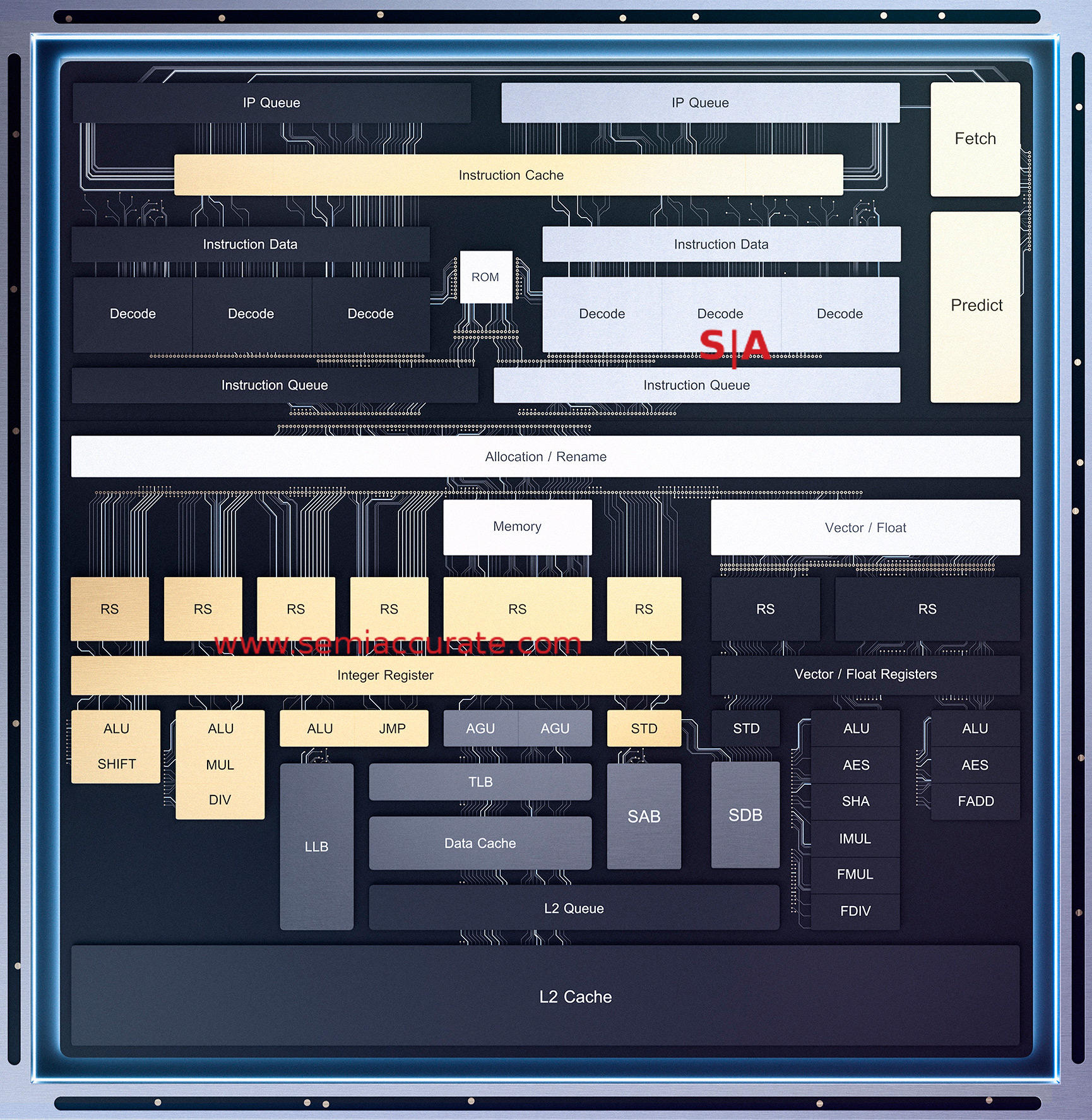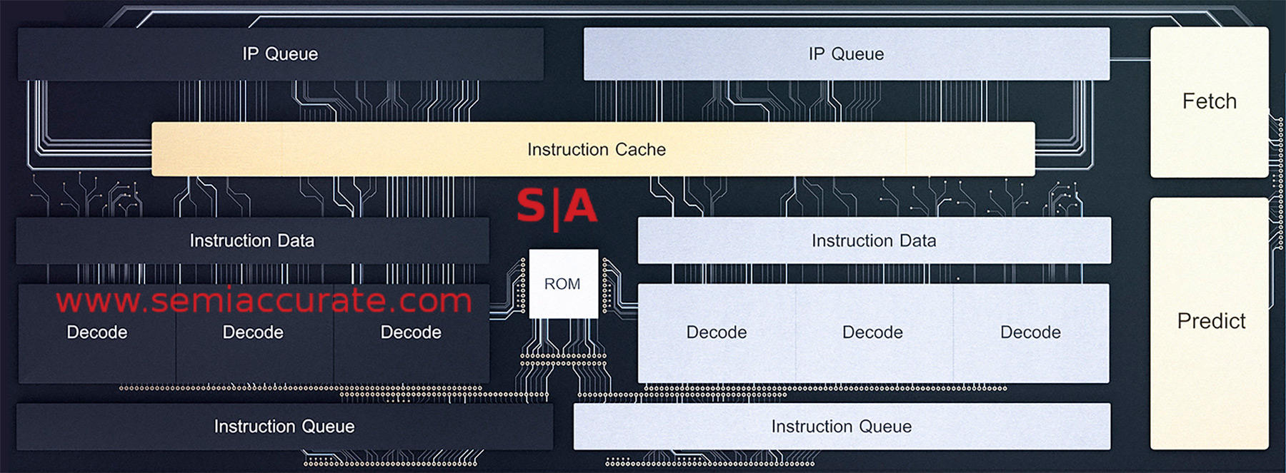 Notice that the queues and decoders are split in to two groups, black and grey, with a few common structure like the fetch, predict, and Icache. That is because the 6-wide decode isn’t actually a 6-wide decoder, it is two 3-wide decoders that operate in parallel. You might have also noticed a lack of structures like a micro-op cache and things related to translating x86 into sane operands, then packing or whatnot as has been the norm since the P4 days or even earlier.