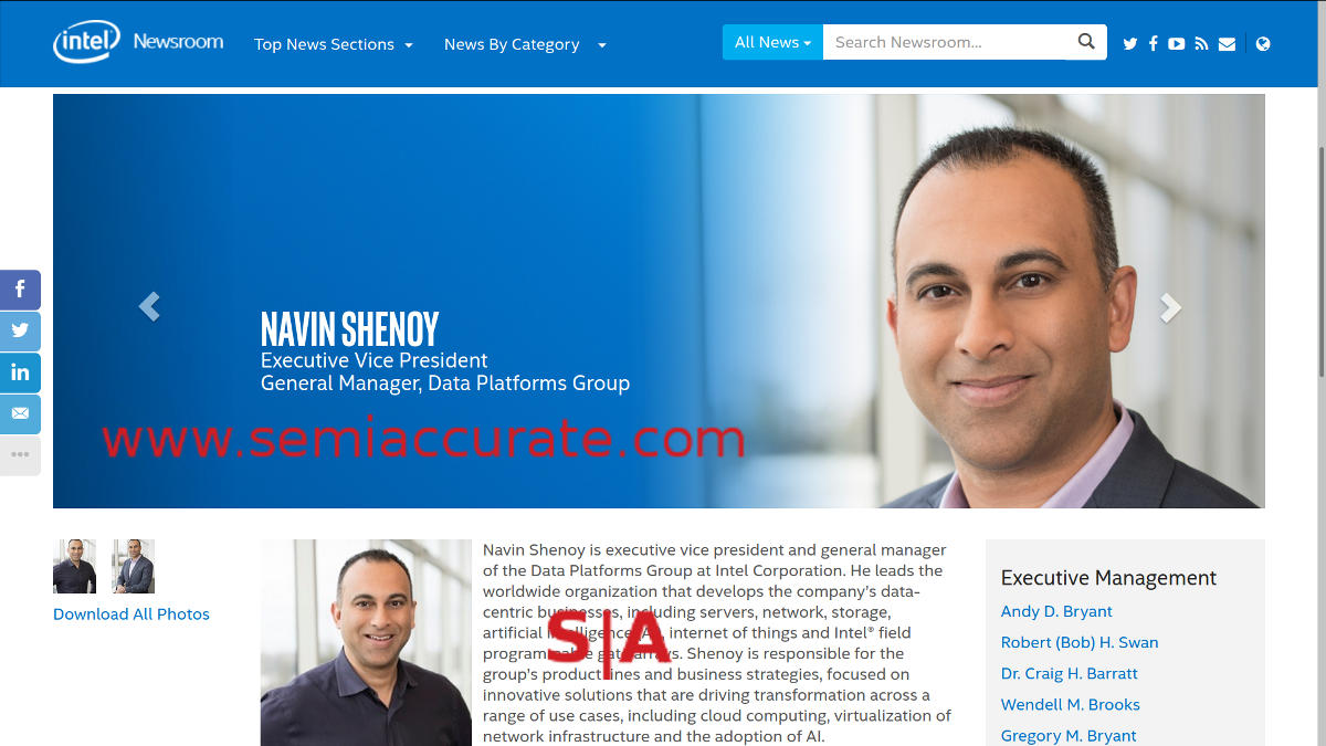 Navin Shenoy is now Executive Vice President and General Manager of Intel’s Data Platforms Group so congratulations to Navin. More interestingly is there hasn’t been an official acknowledgment of such a group existing, it was the Data Center Group (DCG) until recently. The only public announcement of this change was the SemiAccurate article listed above, the change on Navin’s executive bio page, and a few other things in press releases and such.