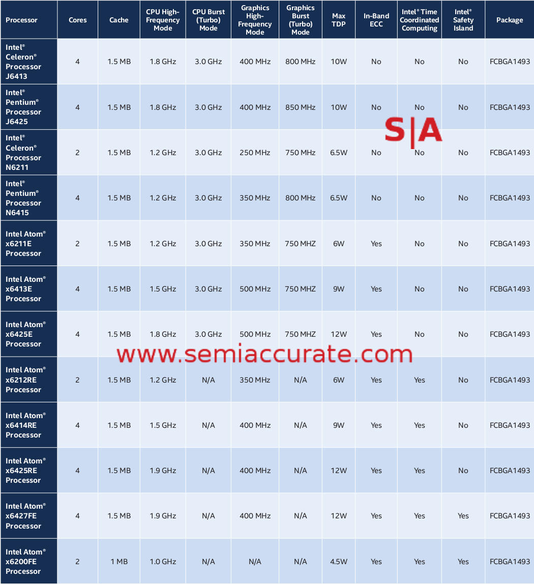 Lets start out with the Atom x6000E, as you can see above there are twelve SKUs with two or four cores and TDPs that range from 4.5-12W. All are based on the Tremont core and have a Gen 11 GPU. This is mainly to support Intel’s push into intelligence at the edge, a large portion of which involves AI and computer vision. However, the x6000E line can drive three monitors. The first four SKUs that are bewilderingly labeled Pentium and Celeron should be ignored, focus on the Atoms with a suffix.