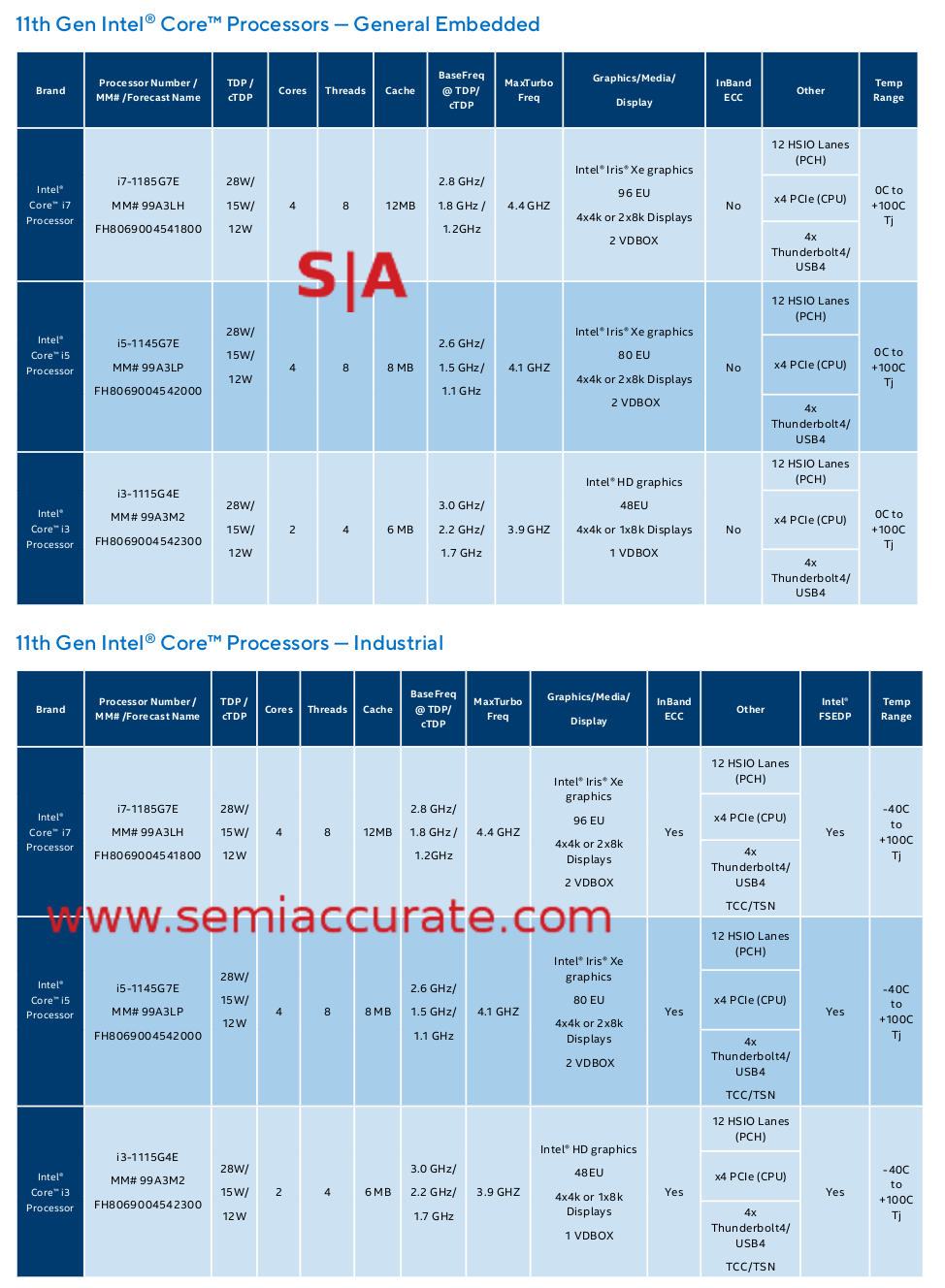 Intel embedded Tiger Lake SKUs