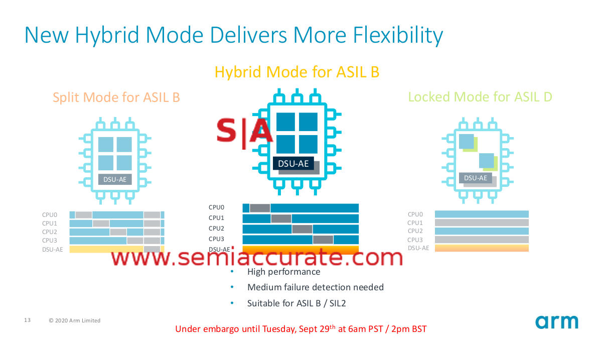 But wait we hear you cry, all the cool kids in school want ASIL B/SIL 2 capabilities but don’t want the periodic down time of the DSU-AE self-check, is there any hope for them? As long as they are sporting the new A78AE, the answer is yes! You just double up your DSU-AE resources and run that in lockstep while all the cores are running in split mode, something ARM calls Hybrid Mode for obvious reasons. Hybrid mode is a little ‘safer’ than Split Mode while offering some of the lockstep advantages with the slightly lower overhead of Split Mode. It won’t hit ASIL D/SIL 3 but it will make those cool kids happy.