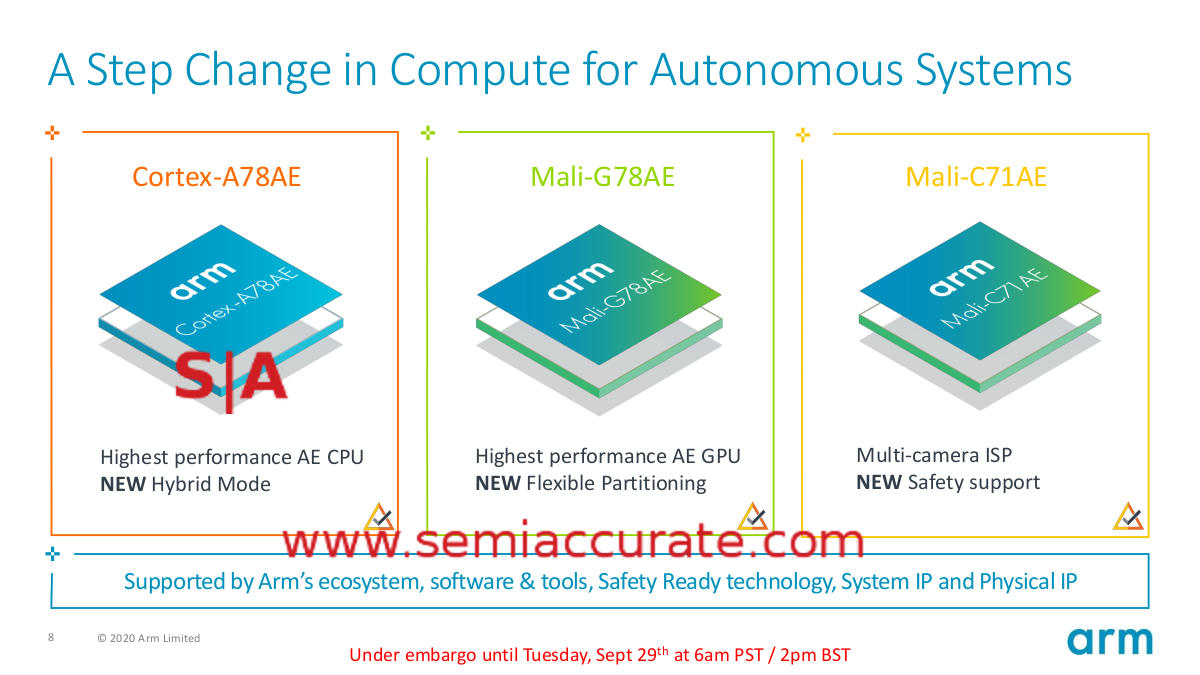 ARM is releasing a trio of automotive and safety modified IP cores today, each significantly changed from their vanilla namesakes. SemiAccurate thinks the Cortex-A78AE is the most interesting but the Mali-G78AE and Mali-C71AE have some new twists too.