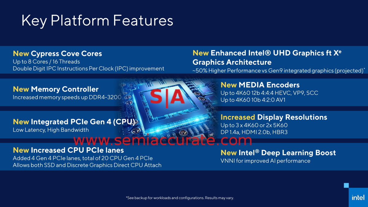 Then we come to the math which may not be SemiAccurate’s strong point but we do think that the 14nm 10900K’s 10 cores are 25% more than the 8 cores in the Rocket Lake part. Where things get tricky is that 25% does indeed seem like a bigger number than 18%. Actually Rocket may have the lead in CPU performance if, and it is a big if, it clocks as high as the 10900K. Given how badly a backport hobbles performance, increases energy use, and all of that, this is unlikely but it could happen. Then again Intel talks about architectural enhancements and IPC but curiously omits any talk of actual CPU performance. They do talk about GPU performance so infer what you will. We will again go out on a limb and say that Rocket will lose to the current parts on most benchmarks for the reasons we discussed above. The details would come out if questions were allowed though, once again any guesses why the disclosure format precluded them?