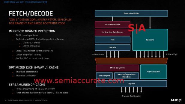 The branch predictor getting faster is nice, as is a slight increase in accuracy, but the big win is in latency. The ‘no bubble’ claim means that once something is predicted, that result can be used on the next cycle instead of having to wait while it is sent to the right block. This is really hard to do and AMD would not comment on exact methods but it takes a large chunk out of latency. Similarly the time it takes to recover from a mispredict is also reduced, again for lower predict latency.