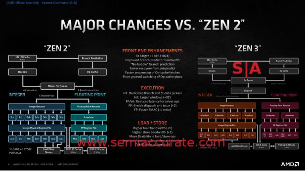As always the devil is in the details but even from a high level point of view it is clear that a lot has changed internally. On the front end, things look fairly similar between the two architectures but Zen 3 split the Micro-Op Queue into Op Queue and Dispatch stages, but the real differences are more nuanced. The BTB doubled, branch predictor bandwidth increased, latency went down, accuracy went up, and transitions are better handled.