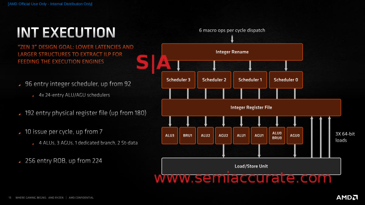 As you can see there are now 4 ALUs, 3 AGUs, a dedicated branch unit, and 2 store units. Each of these 10 units (Note not all are pictured in the slide above) can be fed every cycle which is a big improvement from Zen 2. Also note that the pipes are arranged so each ALU/AGU pair is fed by one scheduler but they are still able to work independently. This is a big part of the efficiency, it allows for more work with less complexity. If you had to summarize it, pipes were added to avoid contention and they are arranged better for similar reasons. Less complexity and wiring tends to make things more efficient, and that is the point.
