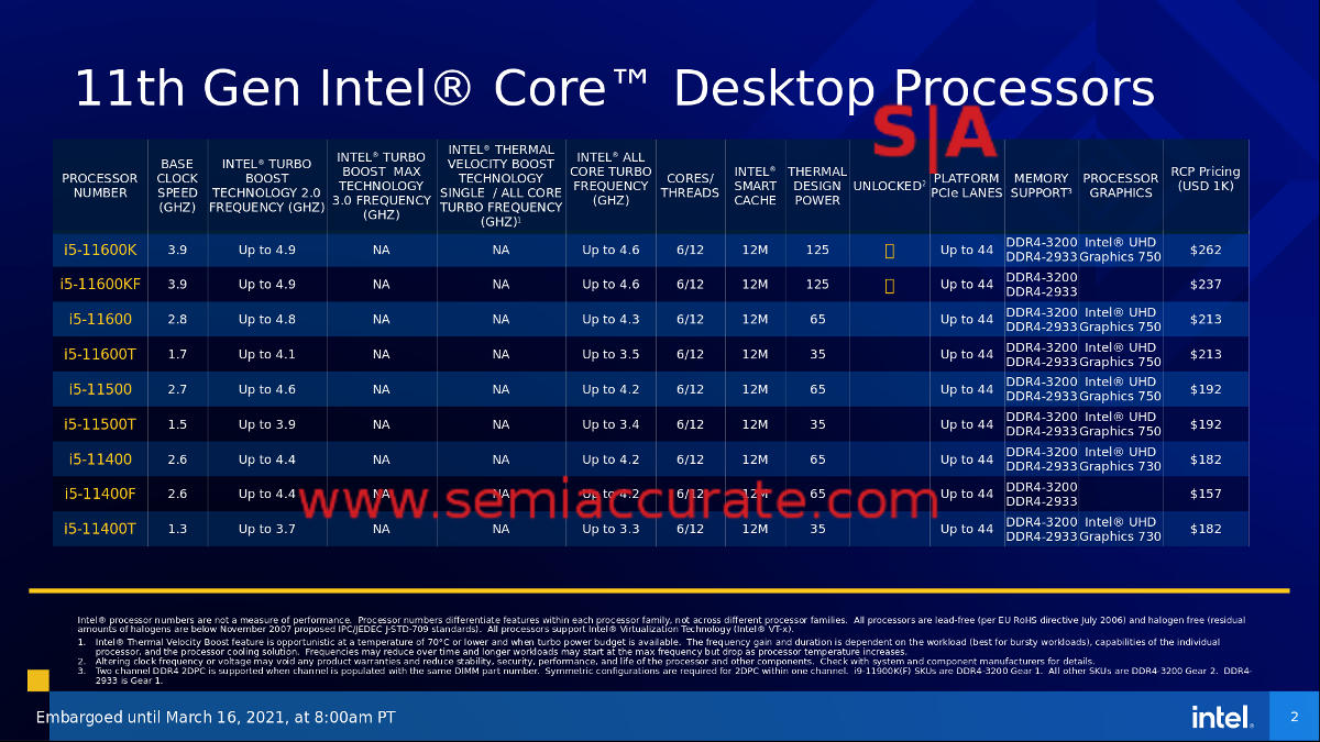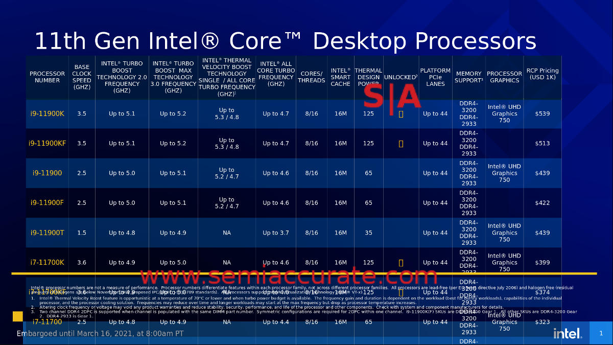 Now here is where it all ties together. Intel is asking $539 for the top end 8C i9-11900K which, according to Anandtech’s testing of closely related SKUs, likely loses to AMD’s 12-C $549 Ryzen 5900X at just about everything. Sure Intel’s wins were a result of testing with a high end CPU and an Nvidia 3080 GPU at 1080p resolutions, something which evaporates when tested at real world settings, but… but… sorry, got nothing here, Rocket loses basically everywhere at everything if you don’t cook the scenarios. $10 less than the Ryzen 5900X is risible, there is no sane reason SemiAccurate can think of that would justify this pricing even if you ignore the eye-watering energy use figures.