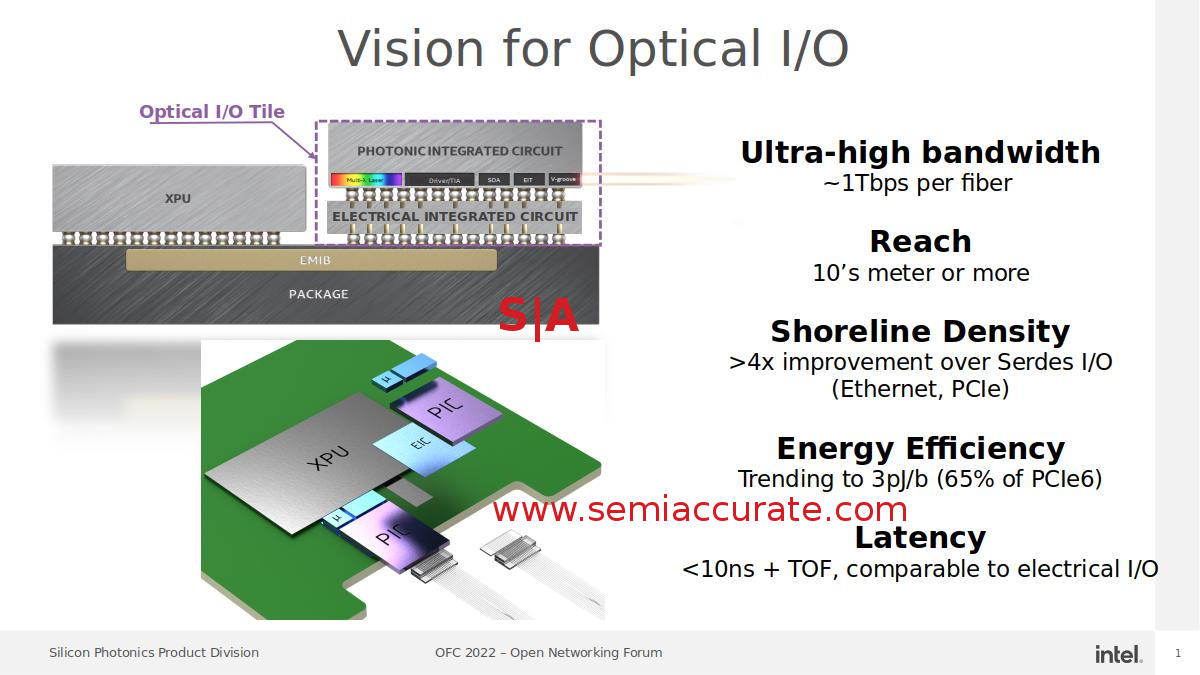 So why is Intel doing this when you can just run the same data over electrical connections without the hassle of optical, InPh processes, and all the rest? Power. Moving data is becoming the critical bottleneck in modern compute for both bandwidth and energy use. You can do what Intel is proposing for this eight laser device across copper but it will be for meters while optical has a reach of kilometers. The current devices are claimed to use <3pJ per bit while doing the same over PCIe6 will need about 50% more energy and just can’t go more than a few meters if you are lucky.