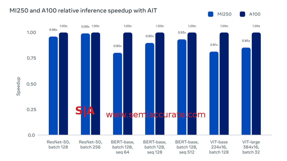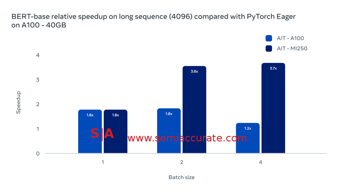 Sure it is only a single framework and Nvidia’s A100 sees a financially significant speedup, but AMD’s MI250 gets quite a bit more. At a batch size of one, both cards are 80% faster with AIT than their native frameworks, that is good. As batch size grows, Nvidia’s performance drops off and AMD’s grows. AMD’s MI250 ends up at 2-3x the performance of Nvidia’s A100 on AIT running BERT in this configuration. If you think about that in dollar terms, it is a pretty stunning number when applied to the hyperscaler set.