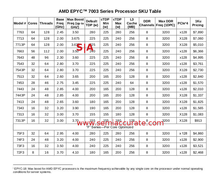 Lets start it out with the obvious, a look at the six new SKUs from AMD. They range from the new, there were no mainstream 8C Milans before, to massive price cuts on the rest. One other bit, four of those six new Epycs are single socket variants (-P suffix) which may explain some of the MSRP cut. Lastly the 16C SKUS are slightly slower than existing options but also use a bit less wattage. If you are thinking this launch is little more than codifying popular existing but not public OEM/volume customer options, you would probably be right.