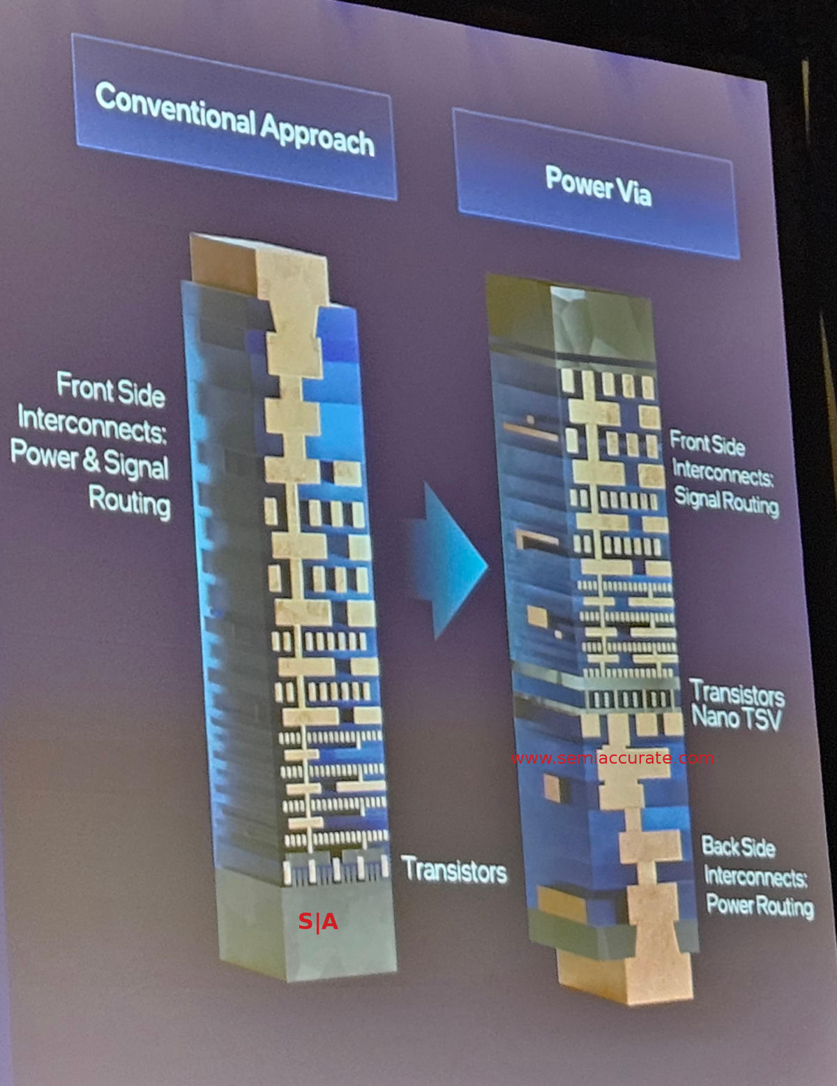 The idea is pretty simple, Intel’s 20A process, also known as 5nm in sane-speak, has two main advances, ribbonFETs and PowerVia. RibbonFETs are cool but if you think about it, while most foundries use FinFETs, Intel uses tri-gate transistors. Until Intel reveals a lot more about 20A and RibbonFETs, going from three to four sides covered by gates isn’t going to excite us all that much even if it is technically difficult.