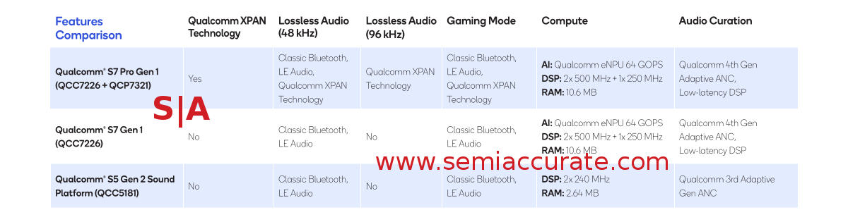 The S7 line is clearly a new architecture with the S5 being an iteration on the older one and the S7 non-Pro having a few features fused off. And AI, can’t forget AI on your earbuds, society would collapse without AI in earbuds you know. Can you tell I am a bit jaded by the AI BS pervading everything now, not just Qualcomm but everyone? How did we ever make toast without AI? OK enough, back to the story.