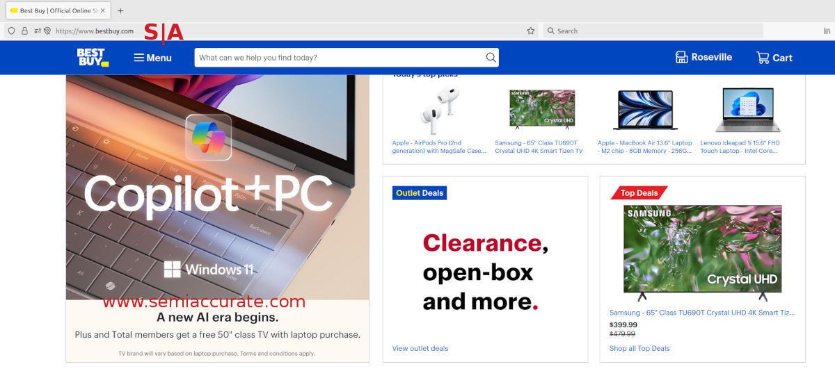 Now we get to a humorous aside, confidence. As we beat into the ground above, when you are confident in your product, you do things one way. When you are not, well, there are lots of hoops a marketing or PR organization can jump through. As you can see above on the front page of Best Buy, if you buy a Qualcomm based AI PC, you get a free 50″ TV. Those PCs start at $999 and run up to $1499 MSRP, $1349 for the cheapest Samsung model. More on that in a sec.