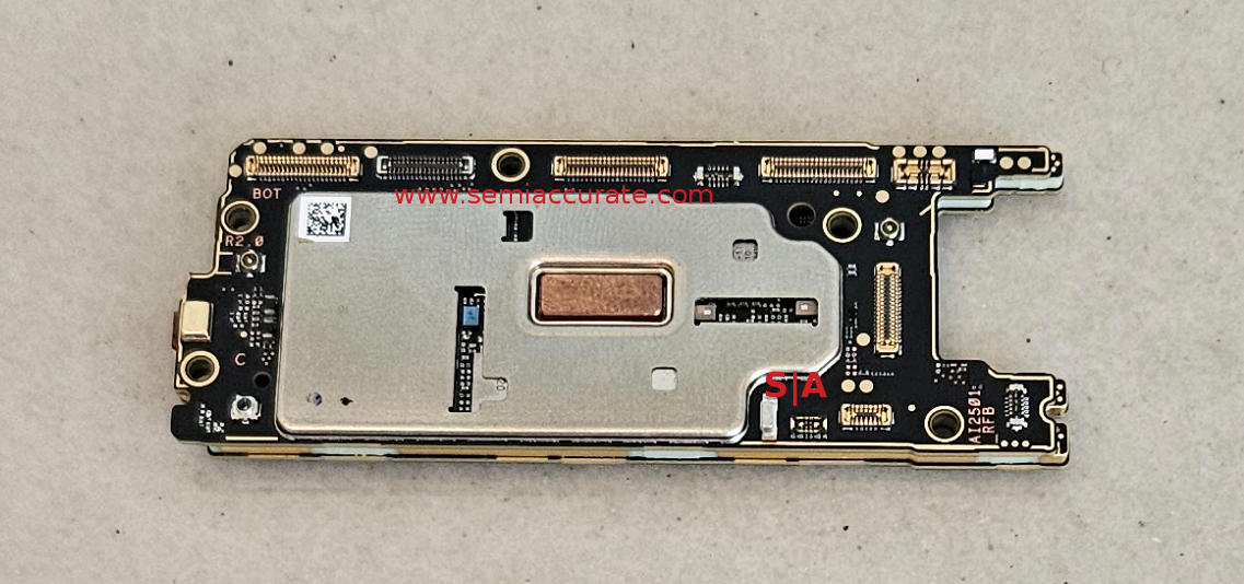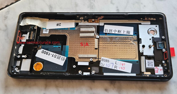 Other bits in the picture that might be useful are the two USB port holes. Above the www watermark is the cutout for the main USB port, the side port is between the two mounting screws on the bottom. Not visible is the thin film LED panel for the back display or the speakers which take most of the blank area outboard of the batteries. The camera module is also missing as was the back panel itself but we suspect that is more to hide some sensor specs until the embargo lifts.