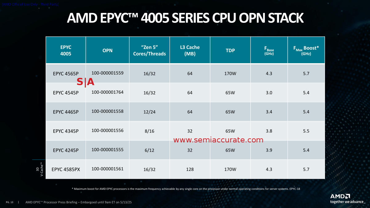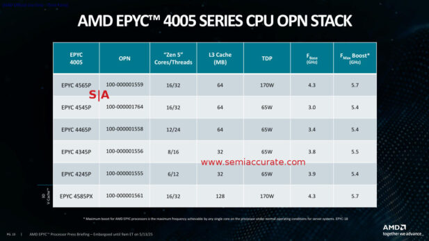 Today AMD introduces it’s new Epyc 4005 series CPUs, a mildly updated Epyc 4004. SemiAccurate doesn’t have much to say about the products but again, it is a PR fail.