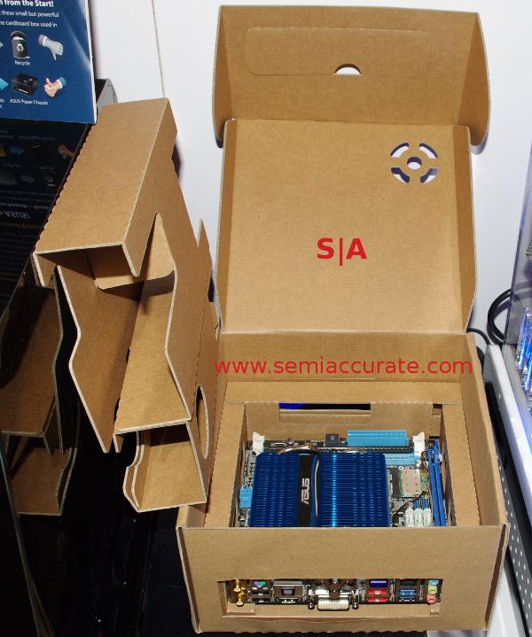 This unmarked cardboard box prototype is theoretically what the E35M1-Deluxe may someday ship in. If you punch out the perforated holes, the box becomes a case for your new PC. It has spots to fit the drives, fan mounting holes, and various standoffs just like a real case. Best of all, it costs basically nothing, you get a free, lightweight, and recyclable case instead of shipping waste.