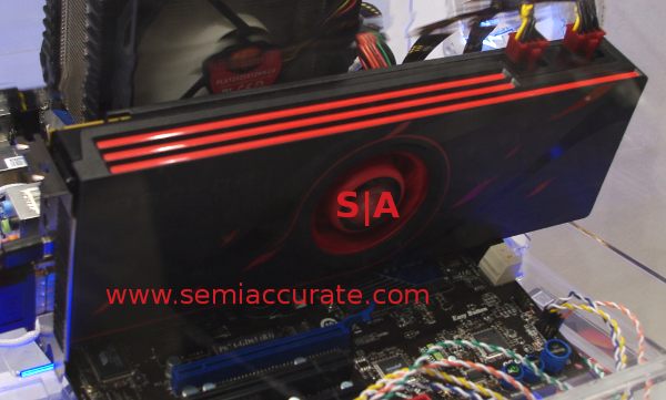 About the only thing that we can say right now is that there are two 8 pin power connectors, meaning that it will ship with a sub 300W TDP forced by aggressively set Powertune limits, but can go much higher.