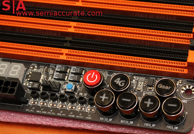 Then we have the buttons, of which the Gear button was a mystery for us. Well, it’s possibly the most interesting feature on the board, especially for professional overclockers. As the name implies, it operates as a gear and divides the Bclk into three which allows for much better fine tuning so that last little bit of performance can be squeezed out of a system. For most other users, this isn’t going to be terribly useful though. Also, the 4G button has been designed to bring the CPU up to 4GHz without and fiddling around. It also involves a memory check and will tune the system according to the type of memory being used to allow for the greatest stability possible.