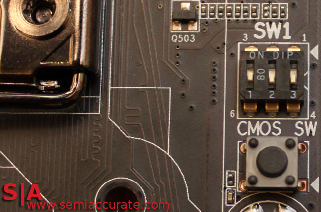 The switch next to the CPU socket is the one that adjusts the PWM frequency as we mentioned in our earlier post and this can be done at any time. The only thing we’d say is that the actual dip switch is a bit on the small side, but part of the reason for this is so that the switches aren’t accidentally moved, but it also makes it a little bit fiddly to change the settings.