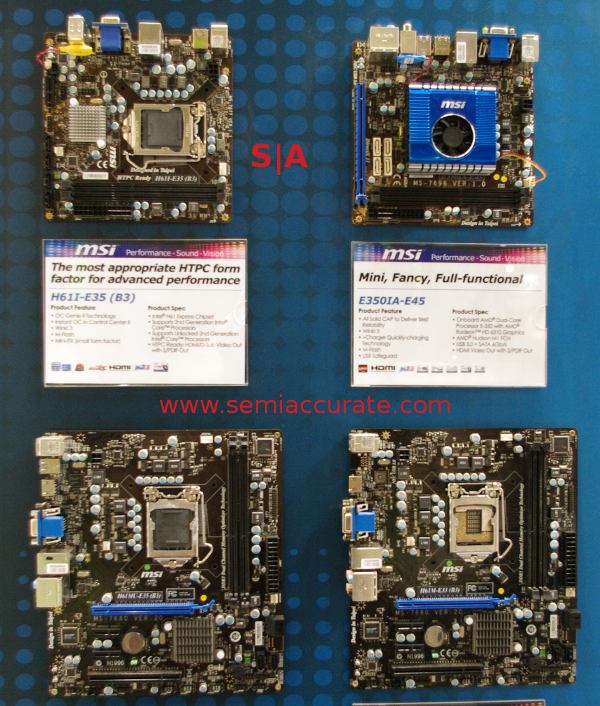 Three of these boards are H61 based, basically low, medium and high feature sets. On the top left, we have the H61I-E35, a mini-ITX HTPC board. It has a few more video out options, and is the high end of the bunch. Right next to it, we have the E350IA-E45, a Brazos board. To answer the question above, this is the one that doesn’t belong.