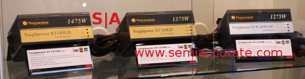 As you can see above, Thermaltake is showing off two Toughpower XTs, a 1375W and a 1475W version that each have a 80+ Gold certification. A year ago, this was said to be painful to make and probably not worth the cost premium. The last one, a 1275W PSU, has a Platinum rating, something that was not even on the cards last year. If you want efficient use of power, this is your PSU.