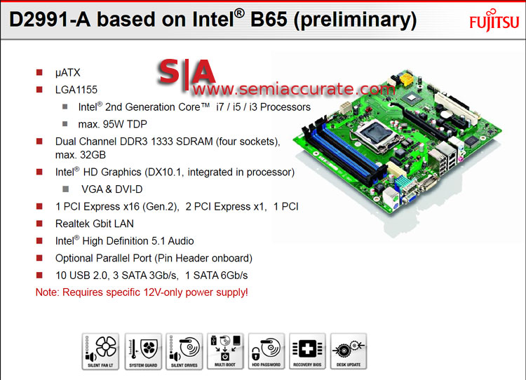 Fujitsu (FJTSY) might not be the most prolific motherboard manufacturer, but they’ve taken over the business from Siemens (SI) and are producing a range of industrial level motherboards. We got our hands on a couple of roadmap updates from the company and spotted something rather interesting, the company has several 12V only motherboards coming out based on Intel’s Cougar Point chipsets, something that could signal a slow shift away from the current triple Voltage system used today.