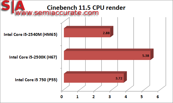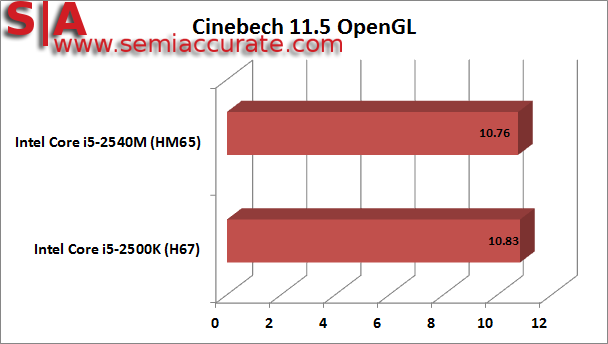 In Cinebench 11.5 things aren’t quite as impressive, although the OpenGL score of 10.76 is very close to that of 10.83 for the 2500K and almost within the margin of error. The dual core CPU is of course suffering here and only manages 2.88 points compared to 5.38 for the 2500K. However, it’s not that far behind an old Core i5 750 CPU at 2.66GHz which scores 3.72 and that’s with two additional cores, albeit no Hyper Threading as per the mobile CPU.