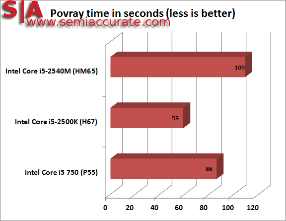 Things are similar in Povray where the Core i5-2410M takes 109 seconds to render the test image while the 2500K does it 59 seconds and the Core i5 750 ends up somewhere between at 86 seconds.