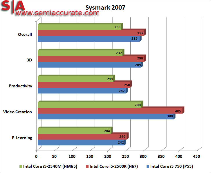 Now for some productivity scores and things are looking up. The review notebook came pre-configured with 4GB of DDR3 1333MHz RAM so it should be noted that this is half the RAM that we used to test the desktop systems with, although we did use the same Intel X25-M SSD to level the playing field as much as we could. In Sysmark 2007 the overall score was came out at 233 which is pretty decent compared to Intel’s desktop Core i5-2500K which scored 297 pair with the H67 chipset. Not quite quad core desktop performance, but it would be interesting to see how it would compare against a dual core desktop CPU.