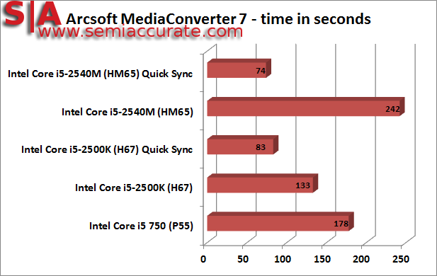 Things improved when we moved to Arcsoft’s MediaConverter 7 which reduced the time it took to transcode the same video to 4 minutes and 2 seconds using the CPU, but that’s still a minute and four seconds slower than the Core i5 750. However, enabling Intel’s Quick Sync and we’re down to 74 seconds, once again beating the Core i5 2500K, albeit only by nine seconds.