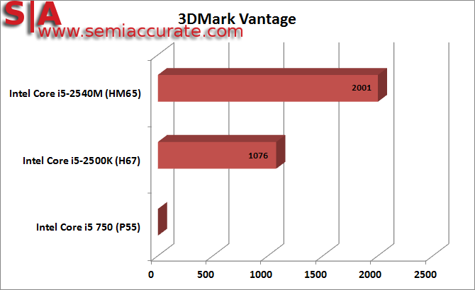 In 3DMark Vantage the Core i5-2540M scores a surprise win with an overall score of P2001 which is almost 300 points faster than the 2500K at stock clocks. This is most likely directly related to the 200MHz faster graphics clock speed when it goes into turbo mode, but we can’t remember when we last saw a notebook that offered better integrated graphics than its desktop equivalent.