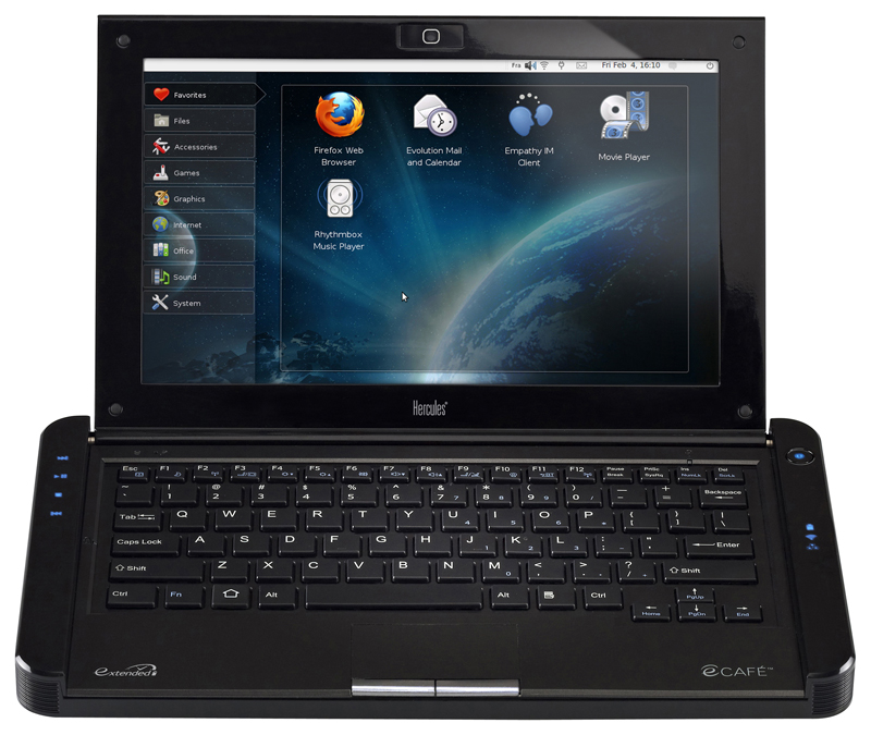 For starters the eCAFÉ netbooks are running a custom Linux based OS which we don’t recognize from the screen shot, but it’s clear that it’s a simplified version targeting consumers with large icons for the various applications, all filed away neatly under a selection of tabs on the left hand side. However, if you don’t like what Hercules provides then you can flick a switch on the system and install whatever OS you want that’s compatible with the platform, although Hercules doesn’t specify what these may be other than saying other Linux distributions. Another unusual feature is that there’s a mini USB port that allows the eCAFÉ netbooks to sync files with either a PC or a Mac.