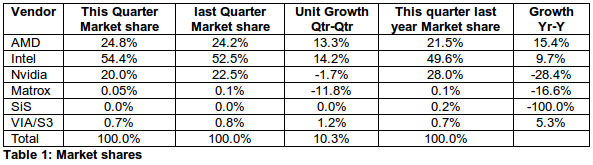 The full release can be found here, but the shorter story is that AMD went from 24.2% to 24.8% in marketshare, Intel from 52.5% to 54.4%, and Nvidia from 22.5% to 20.0%. For year over year numbers, AMD gained 3.3%, Intel 4.8%, and Nvidia lost 8%. Given that total shipments grew about 10% for the quarter, the only surprising thing is that Nvidia actually lost ground there too.